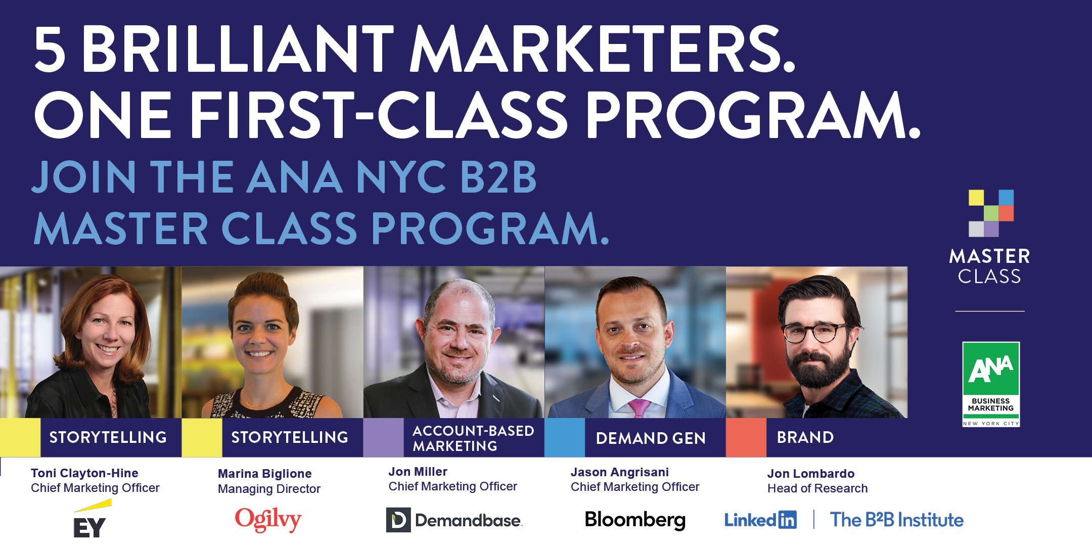 ANA NYC is proud to present the 2022 B2B Master Class Program — a series of professional and career development classes led by true masters of B2B marketing. This four-class virtual program with certification on completion covers Storytelling, Account-Based Marketing, Demand Gen and Brand Marketing.